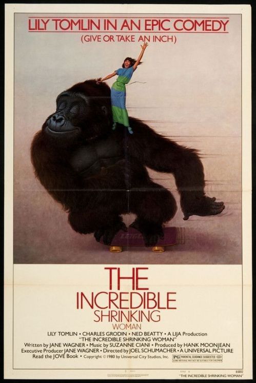 Pat Kramer (Lily Tomlin) is a housewife/mother raising two rambunctious kids (Shelby Balik, Justin Dana) while married to Vance (Charles Grodin) who works in advertising. After being exposed to some products from her husband’s company she begins to shrink until she becomes so small that she is forced to move into a dollhouse and drink out of thimble since a regular glass would be too big for her to hold.